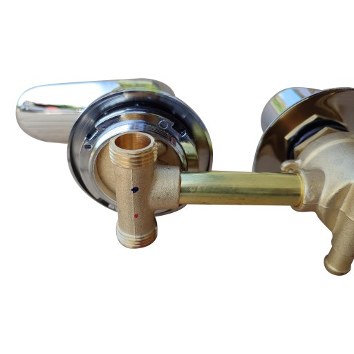 Solidna, mosiężna bateria do kabiny prysznicowej z hydromasażem / paneli prysznicowych i natryskowych posiadająca z jednej strony podłączenia do zimnej oraz ciepłej wody na wężyki 1/2" (mieszacz) a z drugiej strony na 3 funkcje / źródła natrysku na obejmy zaciskowe (rozdzielacz funkcji) jak np. na: