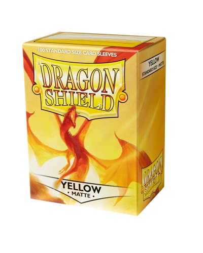 W opakowaniu znajduje się 100 koszulek na karty w kolorze matte yellow firmy Dragon Shield.