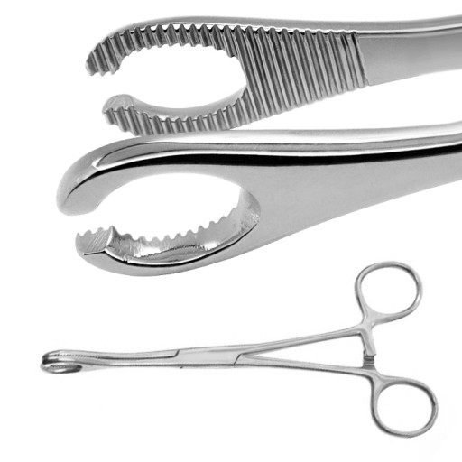 Szczypce do piercingu z dużą, okrągłą, otwartą końcówką. Szczypce służą do przytrzymywania skóry w trakcie przekłucia.