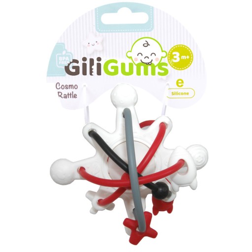 Kosmiczna grzechotka to moc odlotowej zabawy w stylowej odsłonie! Zabawka posiada w swym wnętrzu kuleczkę, która grzechocze przy potrząsaniu. Naokoło niej znajdują się miękkie linki a ruchomymi elementami do przesuwania. Jakby tego było mało, zabawka wyposażona została także w wypustki, przez co sprawdzi się również w roli gryzaka. Jej kształt pasuje idealnie do rączek malucha, co ułatwia najmłodszym chwytanie grzechotki.