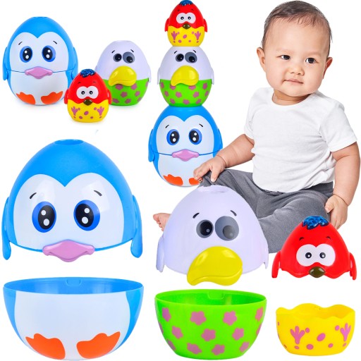 Jajeczka można otworzyć i włożyć jedno do drugiego bądź tworzyć piramidę. Zabawka pomaga rozwijać logiczne myślenie oraz koordynację dziecka.