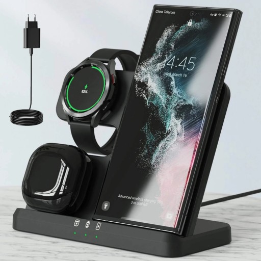🔌Szybka ładowarka 3 w 1 z adapterem QC 3.0 18 W - indukcyjna stacja ładująca. Dzięki tej stacji ładującej 3 w 1 można ładować kilka urządzeń jednocześnie w jednym miejscu, uporządkowane i uporządkowane. Ładuj jednocześnie swój telefon komórkowy, Galaxy Watch, Buds, również jako uchwyt na telefon komórkowy. Kompatybilny również z telefonami iPhone / Huawei. Podstawka ładująca jest zasilana za pomocą dołączonego adaptera 18 W QC-3.0. Bezprzewodowa ładowarka do telefonu ok. Pełne ładowanie przez 3 godziny.