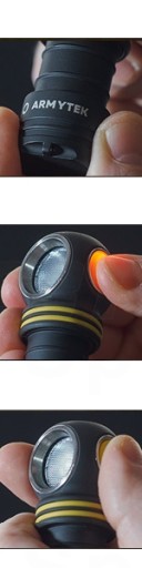 - Odkręć tylną zakrętkę wyłączonej latarki o 1/4, naciśnij przycisk i trzymając wciśnięty, zakręć zakrętkę.