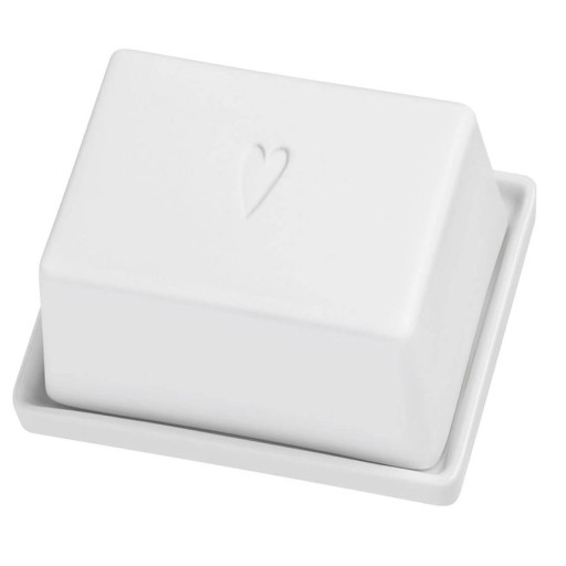 Maselniczka Rader jest częścią kolekcji Good Day, dlatego na pokrywce znajduje się charakterystyczne dla tej serii tłoczone serduszko, a na podstawce ten sam kształt malowany na złoto oraz napis.
