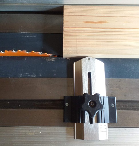 Drewno jest wygodnie przesuwane wzdłuż prowadnicy, ale sformatowany materiał jest po przeciwnej stronie piły.