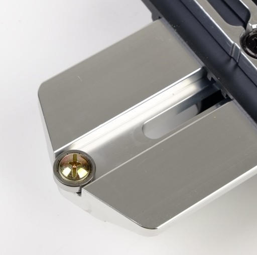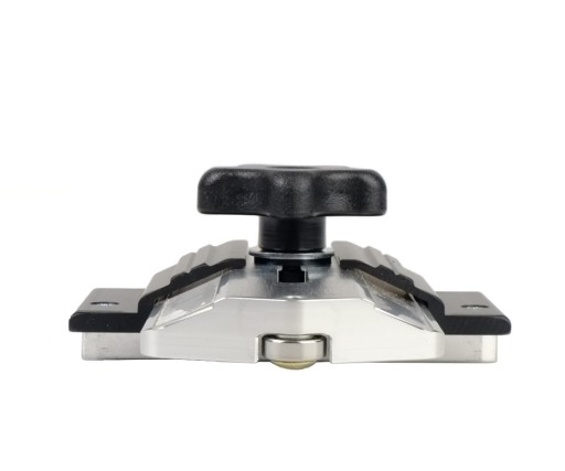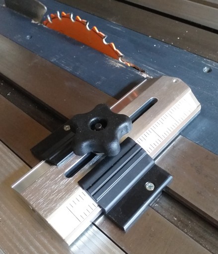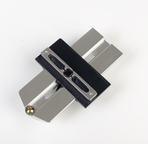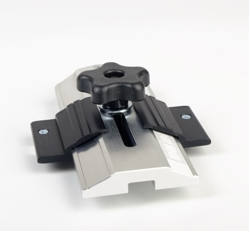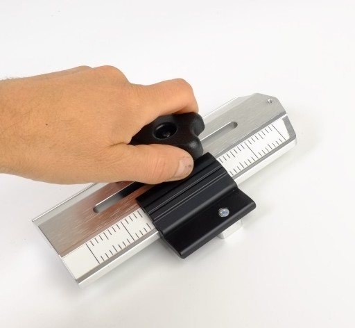 Przyrząd jest solidnie wykonany ze stopu aluminium. Wygodne pokrętło odpowiada za blokowanie przyrządu we właściwym położeniu w rowku piły oraz za odległość łożyska od piły.