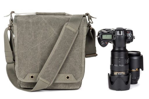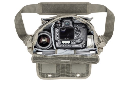 Nieprzyciągająca wzroku, dyskretna, torba naramienna średniej wielkości z minimalistycznym wykończeniem, która nie zwraca uwagi na to, że w środku przenoszony jest sprzęt fotograficzny.