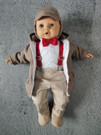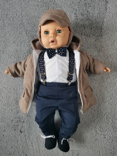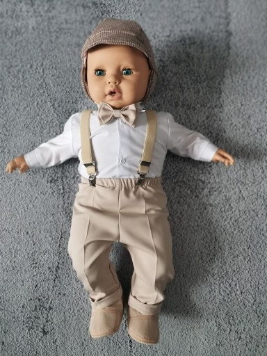Spodnie z delikatnego materiału, na dole nogawki elegancki mankiet. W pasie na gumeczce. Jednak uwagę przyciąga wykończenie kompletu - czyli efektowne szelki