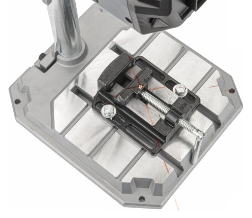 Wiertarka posiada stabilny, mocny i regulowany stół roboczy oraz imadło maszynowe.