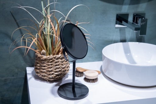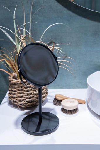 Lusterko kosmetyczne na nóżce w eleganckim czarnym wydaniu. Nasz produkt wyróżnia się solidną i stabilną podstawą o imponującej średnicy 15 cm, co zapewnia pewne i bezpieczne umieszczenie na każdej powierzchni. Lusterko kosmetyczne jest dwustronne i obrotowe, co pozwala dostosować kąt widzenia. Po jednej stronie znajduje się standardowe lusterko, a po drugiej stronie oferuje dwukrotne powiększenie, idealne do precyzyjnego makijażu, pielęgnacji skóry czy innych czynności kosmetycznych, które wymagają większej dokładności. Tafla lustra ma imponującą średnicę 16 cm, co daje wystarczająco dużo miejsca do dokładnego oglądania. Lusterko zostało wykonane z trwałej stali, pomalowanej na elegancki kolor czarny, co nadaje mu nowoczesny i stylowy wygląd.