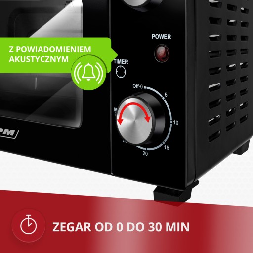 Precyzyjny czas pieczenia (od 0 do 30 min.) odliczy zegar z powiadomieniem akustycznym. Nie musisz pilnować czasu przygotowania posiłków, ustaw tylko odpowiednie parametry za pomocą pokrętła, a minutnik poinformuje Cię sygnałem dźwiękowym, kiedy posiłek będzie gotowy.