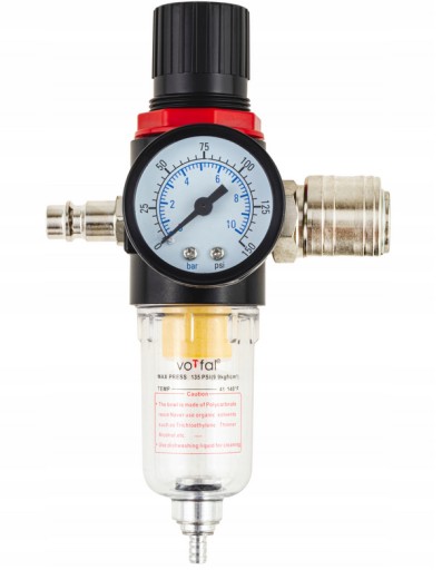 Zespół filtrujący z reduktorem zapewnia pełną kontrolę nad jakością powietrza. Reduktor z manometrem pozwala regulować ciśnienie w układach sprężonego powietrza. Odwadniacz zawierający separator wody oczyszcza sprężone powietrze z wilgoci, oleju, kondensatu i cząstek stałych. Filtruje sprężone powietrze z kropel wody, które powodują zacieki podczas malowania czy też korozję innych narzędzi. Odwadniacz przydatny do urządzeń pneumatycznych (klucze udarowe, szlifierki, polerki, wiertarki itp.)