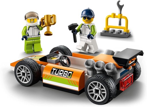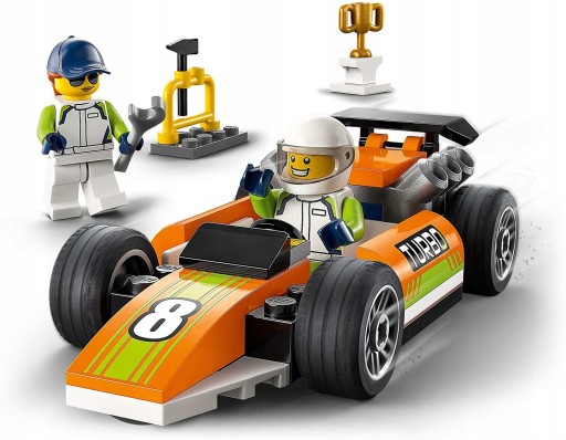- W komplecie ciekawe akcesoria LEGO® dla minifigurek — w zestawie z wyścigówką znajdziesz młotek, klucz, kask i puchar dla zwycięzcy, które urozmaicają zabawę na torze i w pit stopie