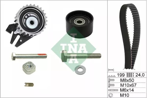 Zestaw zawiera: 531 0844 10 - Napinacz paska rozrządu 532 0611 10 - Rolka kierunkowa / prowadząca 536 0291 10 - Pasek rozrządu DOLZ A300 - Pompa wody Firma INA już od dawna dostosowuje się do wymagań stawianych przez międzynarodowy przemysł samochodowy. Aktualnie firma INA produkuje elementy i układy dla mechanizmów rozrządu zaworowego, napędów podstawowych, napędów pomocniczych i modułów zmiennych faz wałka rozrządu dla producentów pojazdów i na potrzeby rynku części zamiennych do samochodów. INA produkuje seryjnie elementy dla napędów pasowych od 1977 r. Od 1995 r. firma rozpoczęła rozwój i produkcję kompletnych napędów pasowych. Jeśli weźmiemy pod uwagę, że co roku firma produkuje ponad 50 milionów części, to stwierdzić można, iż w niemalże każdym pojeździe na całym świecie można znaleźć jakiś element napędu pasowego firmy INA