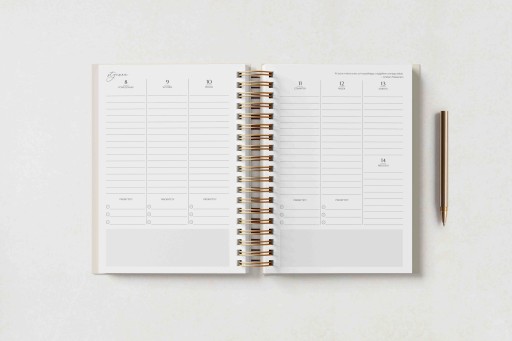 - Harmonogram tygodnia rozpisany na dwóch stronach. Priorytety dzienne, miejsce na Twoje notatki oraz lista rzeczy do zrobienia.