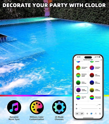 Popraw swoje wrażenia z basenu: oświetlenie basenowe zawiera czuły mikrofon wbudowany w kontroler, który umożliwia pulsowanie świateł i zmianę koloru w zależności od dźwięku otoczenia i muzyki.