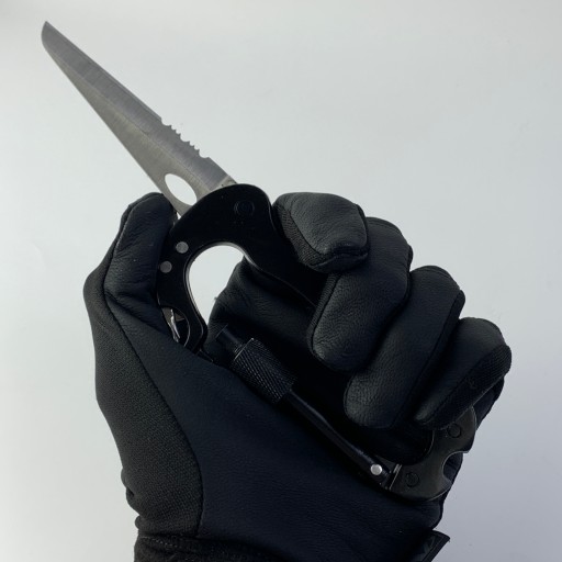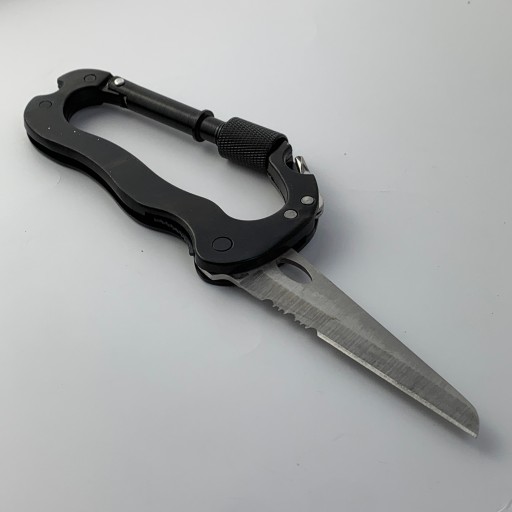 Karabińczyk wykonany jest ze stopu aluminium oraz stalowym nożem. Waga karabińczyka 80g