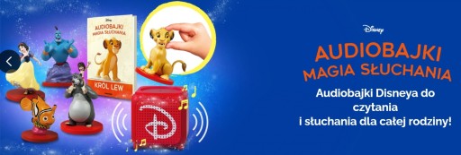 Kolekcj bajek klasycznych i współczesnych do słuchania i czytania. Wspaniała zabawa dla całej rodziny z bohaterami bajek Disneya: Królewna Śnieżka, Król Lew, Aladyn, Gdzie jest Nemo i inne . Kolekcja AUDIOBAJKI – MAGIA SŁUCHANIA, to zabawa i czytanie, jakich dotąd nie było! Wystarczy umieścić figurkę na głośniku by posłuchać opowieści. Czytanie i słuchanie bajek jest konieczne do prawidłowego rozwoju dziecka. Bajki poszerzają słownictwo naszych pociech, pobudzają wyobraźnię, wpływają na kreatywność oraz kształtują charakter. Wspólne czytanie i słuchanie bajek, to świetny pretekst do rozmowy z dzieckiem o tym co ważne. Nasza niezwykła kolekcja, to nie tylko wspaniała zabawa ale również nauka czytania ze zrozumieniem, zapamiętywanie tekstu, które należy ćwiczyć od najmłodszych lat. Dzięki Audiobajkom, każde dziecko będzie to robić bez wysiłku i z przyjemnością. Dzięki wyjątkowej technologii dziecko może słuchać bajek przez cały dzień. Ponadczasowa literatura