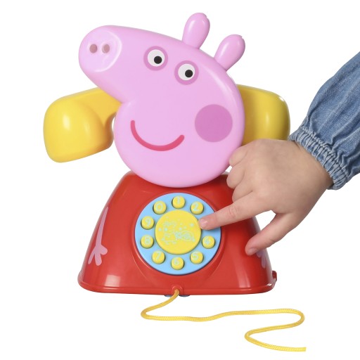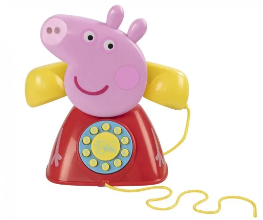 Witam, z kim rozmawiam? Och, to Peppa! Odbierz telefon, gdy zadzwoni! Porozmawiaj z Peppą i przyjaciółmi! Dowiedz się, jak działa prawdziwy telefon z tym zabawnym telefonem w kształcie świnki Peppy. Telefon wyposażony jest w dźwięk dzwonka i przyciski wybierania z dziesięcioma różnymi tonami klawiszy, a także przewód, który umożliwia pociągnięcie za sobą. Gdy słuchawka telefonu jest podniesiona, naciskaj cyfry, aby usłyszeć parskanie Peppy. Kiedy telefon jest wyłączony, naciskaj cyfry, aby usłyszeć chichot Peppy, Suzy lub pisk Rebeki. Zabawka odtwarza również przewodnią piosenkę z bajki Świnka Peppa.