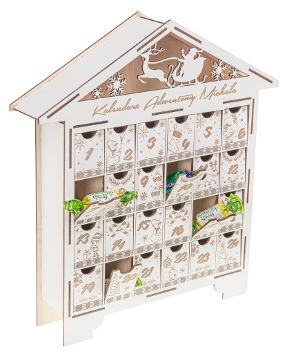 Mamy dla Ciebie specjalna ofertę - kalendarz adwentowy, w formie drewnianego domku, który posiada 24 szufladki na słodycze lub drobne przedmioty. Świetnie sprawdzi się jako ozdoba świąteczna w Twoim domu.