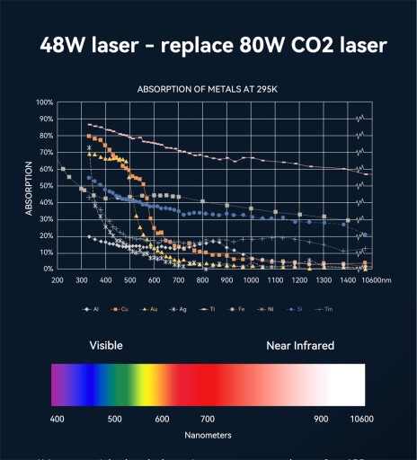 bardzo rozległy obszar ogniskowania lasera jest zmniejszony do 0,1 * 0,1 mm, laser o dużej średnicy może z zniszczenia grubego drewna, czarnego akrylu; Może bezpośrednio grawerować lustro ze stali nierdzewnej, metal, ceramikę, szkło, grawerowanie i transmisję strumieniową niż 30 W, o 40%, może być porównywalna z potwierdzeniem przerwania laserem CO₂ o mocy 80 W.