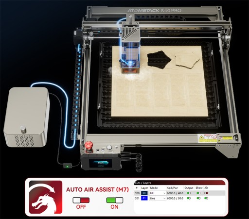 Standardowe wspomaganie powietrza lub górnego przepływu F30Pro. Można włączyć tryb Lightburn M7, aby automatycznie przełączać wspomaganie powietrza w różnych trybach cięcia/grawerowania. Możliwość transmisji poprawionej, po której następuje rozprzestrzenianie się, dzięki czemu ATOMSTACK S40 Pro jest naprawdę maszyną do cięcia laserowego.