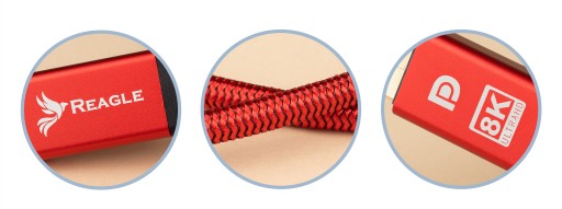 Przewód Reagle został wykonany z najwyższą dokładnością. Posiada zatyczki, które uniemożliwiają dostanie się kurzu do wtyków. Jego gamingowy czerwony kolor idealnie wpasuje się w biurko gracza. Nylonowy oplot, pozłacane i aluminiowe wtyki ochronią kabel przed uszkodzeniami mechanicznymi i znacznie wpływają na komfort użytkowania.