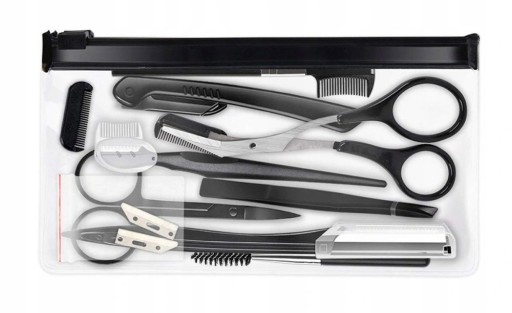 - W komplecie znajdują się nożyczki, maszynki do golenia, pędzelki, grzebień, pęseta oraz dodatkowe ostrza.