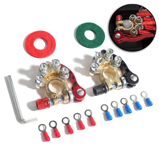 Zestaw wysokiej jakości klem do akumulatora z zaciskami, zapewniające doskonałe przewodnictwo elektryczne.