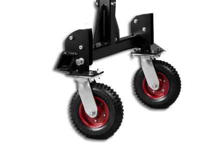 KOŁA JEZDNE - Duże (220 mm/60 mm), niepompowane i łożyskowe, a więc wytrzymałe. Umożliwiają szybkie i bezpieczne przemieszczanie zaginarki, nawet po trudnym terenie. Można je złożyć.