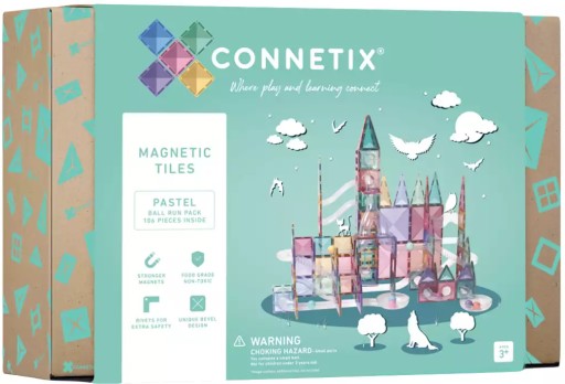 Zestaw Pastel Ball Run Pack świetnie sprawdzi się jako samodzielna, niezależna zabawka, a możliwości kreatywnego budowania można poszerzyć kwadratowymi i trójkątnymi klockami podstawowymi z innych zestawów Connetix, których Pastel Ball Run Pack nie zawiera.