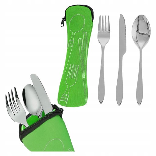 - Zestaw 3 sztućców (widelec, nóż, łyżka) w wygodnym neoprenowym etui na zamykanym na zamek połączenia.
