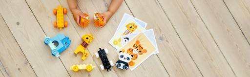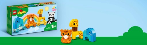 Zabawka ze słoniem, tygrysem, żyrafą i pandą podsunie każdemu małemu miłośnikowi zwierząt wiele pomysłów. Możliwość konstruowania, przerabiania, ustawiania wagoników i zwierzątek i układania elementów jeden na drugim pozwoli dzieciom odkryć czarodziejski świat wcielania się w role, aprzy okazji ćwiczyć zdolności manualne. Są tam także nowości, takie jak kołysząca się szyja żyrafy! Zestaw zawiera karty do budowania z obrazkami modeli — można układać na nich klocki, by budowanie było łatwiejsze. Pociąg z tego zestawu można połączyć z innymi jeżdżącymi zabawkami DUPLO, więc dawka frajdy może być jeszcze większa.