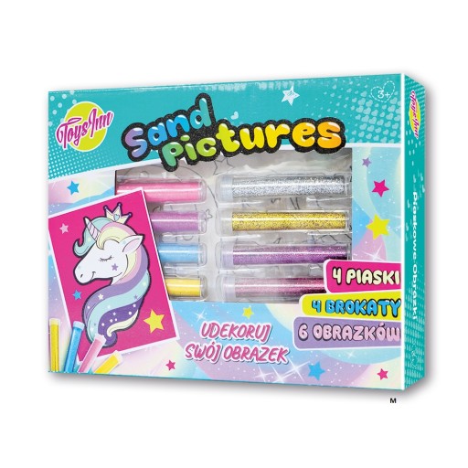 Zestaw zawiera: 4 kolory piasku, 4 kolory brokatu, 6 obrazków, pędzelek.