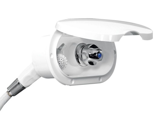 Prysznic jachtowy z pojemnikiem, przewodem oraz baterią do wody zimnej. W komplecie zestaw uszczelek.