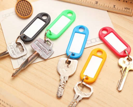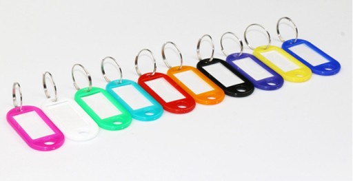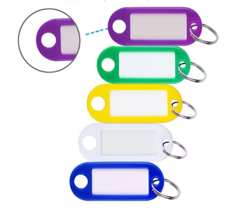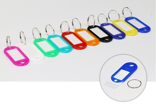 Identyfikatory do kluczy to kolorowe breloki, wykonane z trwałego plastiku, z wyjmowaną karteczką i metalową zawieszką do przypięcia kluczy.