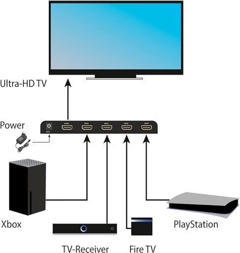 - Umożliwia podłączenie 4 źródeł HDMI, takich jak PC, PS5, Fire TV i konsola do gier Xbox Series X do telewizora, monitora, projektora wideo lub amplitunera AV/soundbar, obsługuje funkcje gier, takie jak VRR, Freesync i ALLM