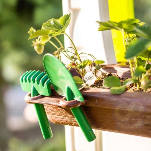 Zawiera 2 kosze do recyklingu (żółty i niebieski), zbiornik na deszczówkę, narzędzia ogrodnicze (łopatkę i grabki), wiatrak i imitację panelu słonecznego. Wyposażony jest również karmnik dla ptaków.