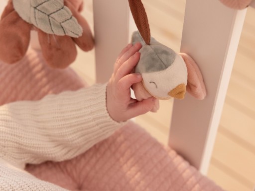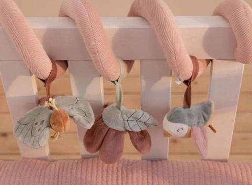 Spiralka sprawdzi się idealnie jako zabawka dla malucha w łóżeczku, gondoli lub foteliku samochodowym. Pozwala stymulować koordynację wzrokową malucha, pomaga mu poznawać różne faktury materiału oraz przez swoje różnorodne kształty potrafi zaciekawić na długie godziny. Posiada pluszaki, takie jak ptaszek, motylek oraz kwiatek.