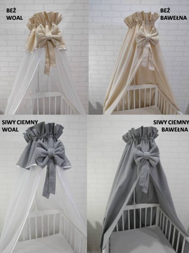 Baldachim wykonany z wysokiej jakości 100% bawełny lub woalu. Wymiary : wys. ok 155cm , szer. ok 220cm - przeznaczony na krótszą część łóżeczka.