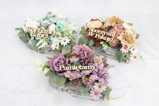 Kompozycje wykonuje ręcznie z tego względu układ czy rodzaj ozdób i dodatków może się nieco różnić od zdjęć. Zawsze jednak zostaje zachowany styl i kolorystyka.