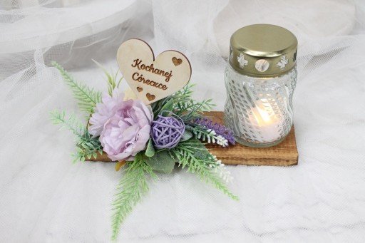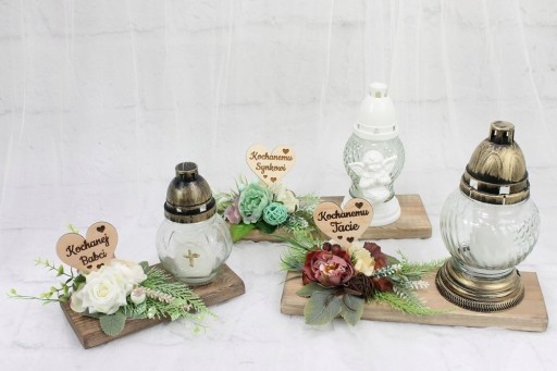 Wyjątkowości tej kompozycji dodaje piękny drewniany napis oraz niebywały znicz z delikatnym wkładem LED.