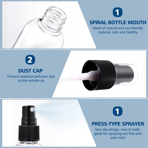Butelki z rozpylaczem są bardzo odpowiednie do podróży, wycieczek i tak dalej. Może być używany do przechowywania niektórych produktów na bazie wody, takich jak olejki eteryczne i balsamy. Kobietom często nie opłaca się zabierać w podróż kilku butelek kosmetyków, ponieważ są one ciężkie i zajmują dużo miejsca w walizce. Dlatego butelka z rozpylaczem tutaj może ci bardzo pomóc. Jest mały, kompaktowy i szczelny, możesz bez obaw umieścić perfumy lub wodę do makijażu, którą kochasz najbardziej lub której używasz najczęściej.