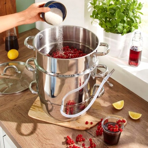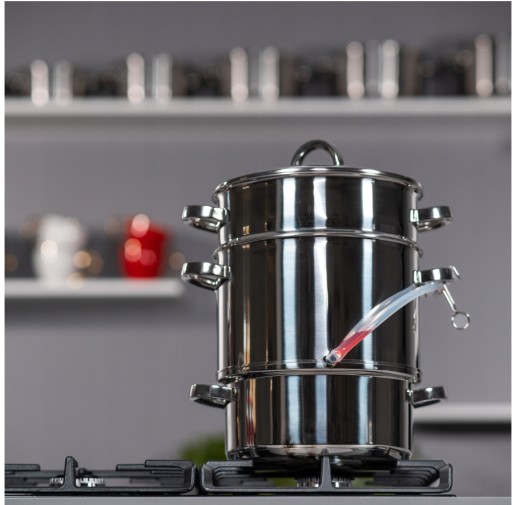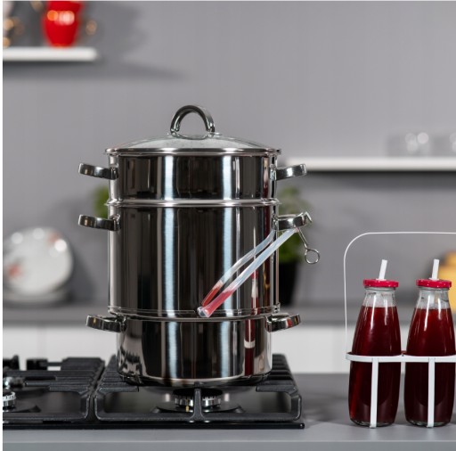 Wszystkie elementy zostały wykonane z najwyższej jakości stali nierdzewnej, których główną zaletą jest wysoka trwałość i wytrzymałość, odporność na korozję, odkształcenia termiczne i uszkodzenia mechaniczne. Grube ścianki i wielowarstwowe dno sprawiają, że naczynie nagrzewa się bardzo szybko i zachowuje stałą temperaturę wewnątrz. Dzięki temu, proces przyrządzania soku trwa znacznie szybciej niż w standardowych sokownikach. Używając tego produktu, masz pewność, że przygotowanie soku zawsze zakończy się powodzeniem i nie zmarnujesz najmniejszej ilości żywności.
