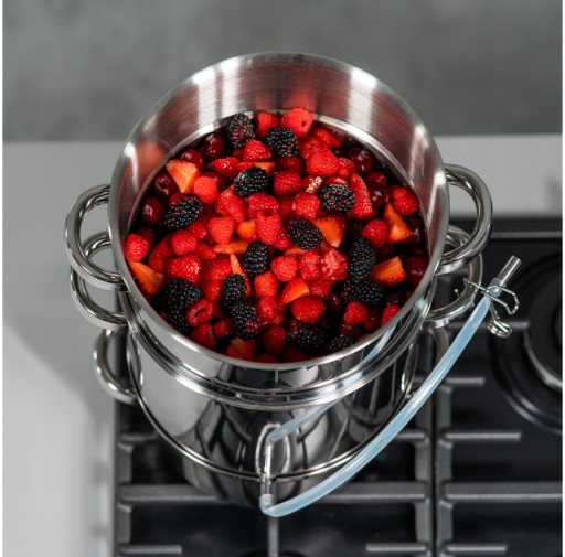 - Uruchom kuchenkę i doprowadź wodę w dolnej części sokownika do wrzenia. Wrząca woda spowoduje uwalnianie pary, która będzie wypłukiwać soki z owoców i warzyw.