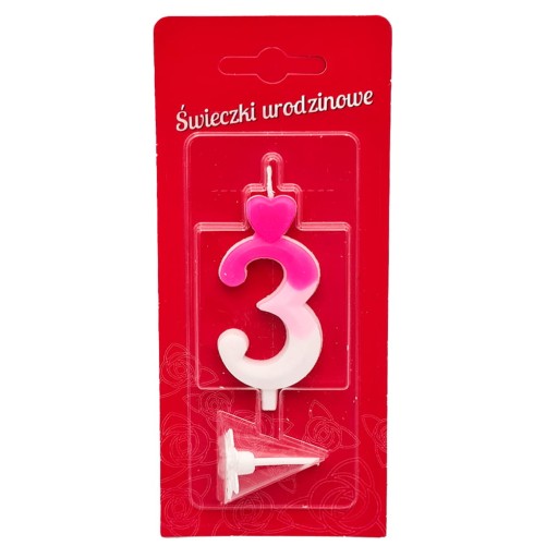 Świeczka urodzinowa: wyjątkowa, cieniowana biało-różowa w kształcie cyfry trzy. Cieniowane przejście z barwy białej różowej, z góry urocze wykończenie na knot w kształcie serduszka. W opakowaniu plastikowa podstawka z nóżką do wbicia w tort. Stabilnie stoi. Świeczka zapakowana pojedynczo, w elegancki blister. Opakowanie zawiera 1 świeczkę z podstawką. W naszej ofercie posiadamy świeczki urodzinowe cyfry różnych kształtów i kolorów. Świeczki dekoracyjne na tort to doskonały pomysł, aby uatrakcyjnić wyjątkowe okazje.