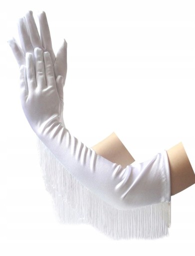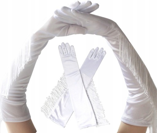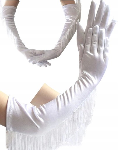 Rękawiczki satynowe damskie długie lekko elastyczne, retro z frędzlami
