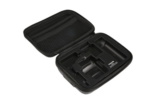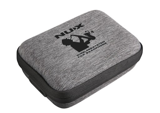 Bezprzewodowy system NUX B-6 do saksofonu jest również wyposażony w futerał do przechowywania, który może ładować jednocześnie nadajnik i odbiornik, zapewniając do 15 godzin dodatkowej pracy na baterii.