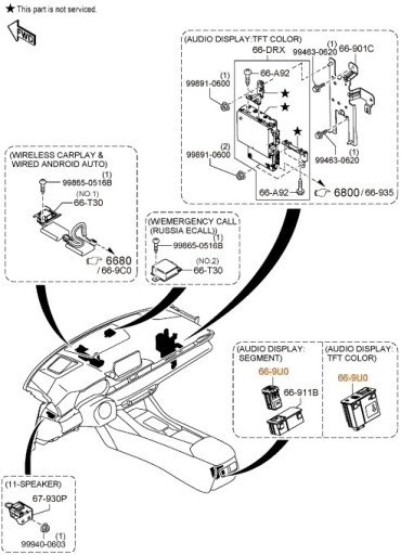 - 1x TK78669U0E (Złącze portu USB i AUX pod Android Auto i Carplay, pozycja numer 66-9U0 "Audio Display TFT Color" na schemacie)