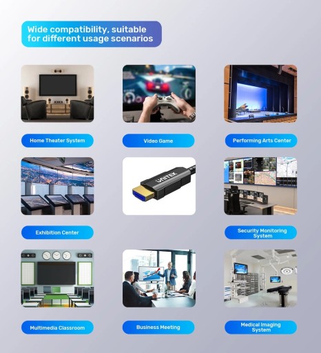 Kabel światłowodowy HDMI umożliwia podłączenie odtwarzaczy: Blu-ray 4 K, smart 3 D, media PC, Apple TV, PS 4 PS 3 XBox One, XBox One S, Roku Ultra czy laptopa do telewizora, monitora lub projektora.